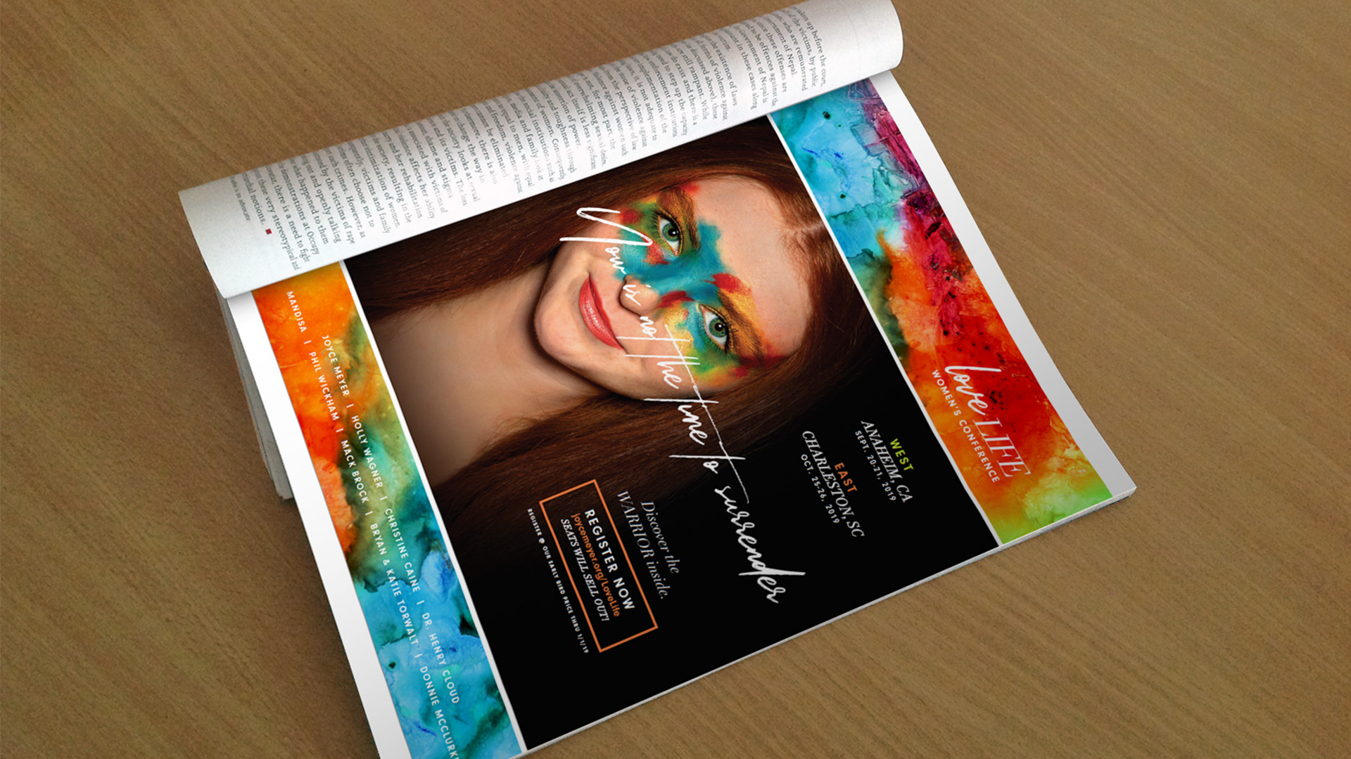 Love Life Women’s Conference is Joyce Meyer Ministries Annual Women’s Conference. Following the theme of “Discover the Warrior Inside” the conference aimed to help the women in attendance discover their inner warrior and confidence in winning the battles they face— big and small. Through faces armed with beautiful battle paint and bright, bold, and colorful artwork, the visuals for the conference were striking, bold, and punchy— just like the “warriors” we were calling the women to become.