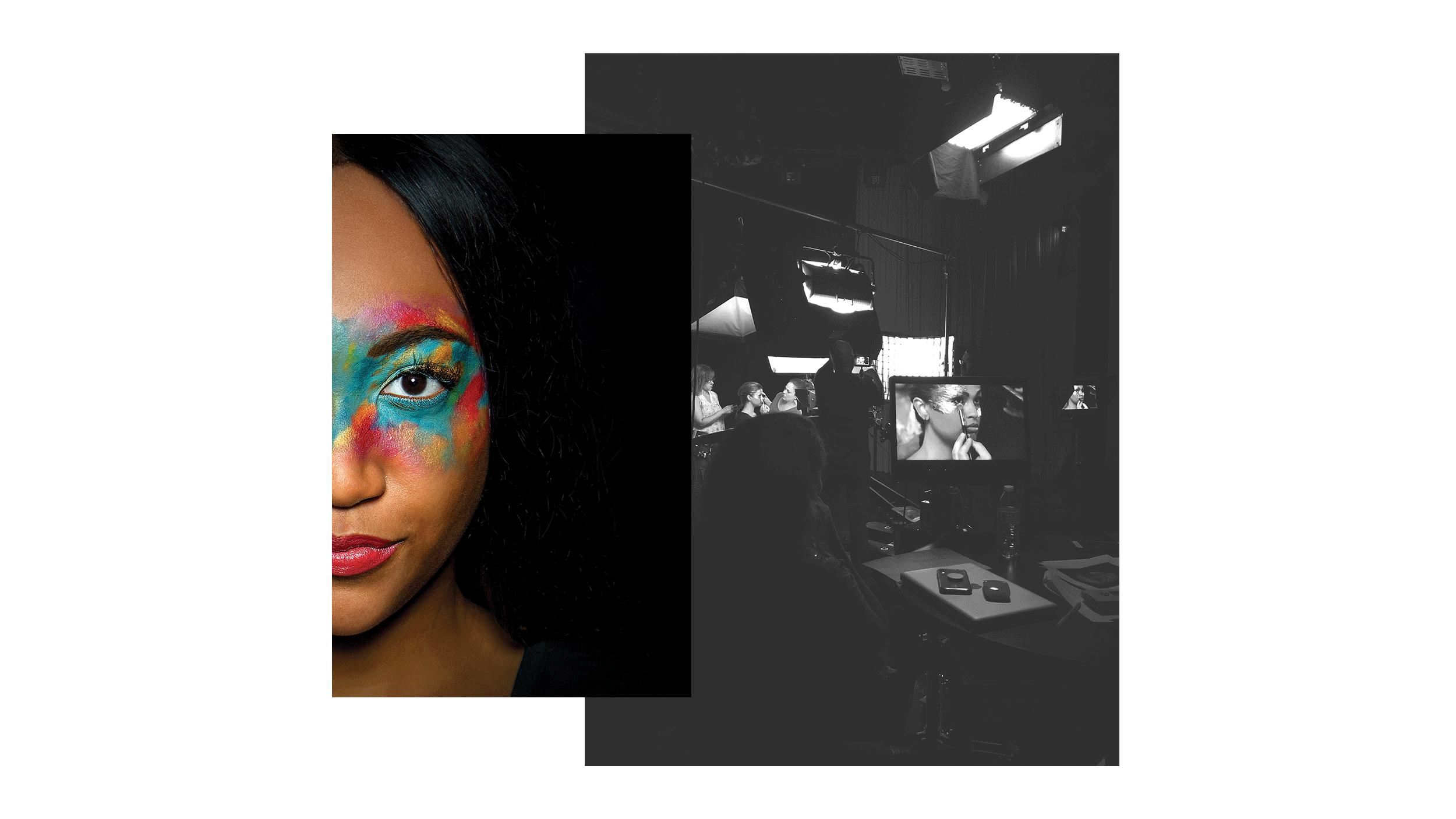 Behind–the–scenes shot of our campaign photoshoot where makeup artists gilded and painted the talent’s faces. To the left are a few final images from the photoshoot used throughout the promotional campaign for the conference.